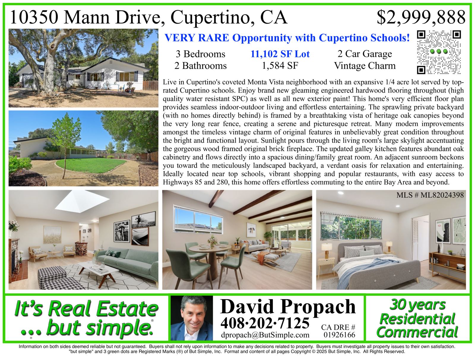 Very rare opportunity in Cupertino's coveted Monta Vista neighborhood with an expansive 1/4 acre lot served by top-rated Cupertino schools. Enjoy brand new gleaming engineered hardwood flooring throughout (high quality water resistant SPC) as well as all new exterior paint! This home's very efficient floor plan provides seamless indoor-outdoor living and effortless entertaining. The sprawling private backyard (with no homes directly behind) is framed by a breathtaking vista of heritage oak canopies beyond the very long rear fence, creating a serene and picturesque retreat. Many modern improvements amongst the timeless vintage charm of original features in unbelievably great condition throughout the bright and functional layout. Sunlight pours through the living room's large skylight accentuating the gorgeous wood framed original brick fireplace. The updated galley kitchen features abundant oak cabinetry and flows directly into a spacious dining/family great room. An adjacent sunroom beckons you toward the meticulously landscaped backyard, a verdant oasis for relaxation and entertaining. Ideally located near top schools, vibrant shopping and popular restaurants, with easy access to Highways 85 and 280, this home offers effortless commuting to the entire Bay Area and beyond.